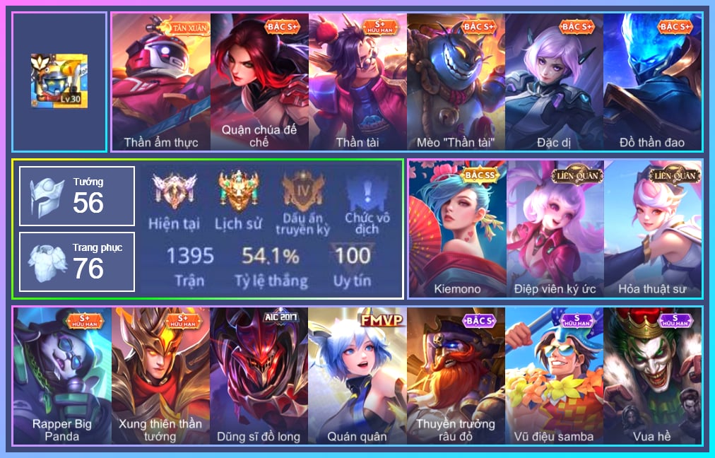 Valhein Hoàng tử Quạ, Triệu Vân Quý Công Tử, Triệu Vân Cẩm y vệ_ Hỏa Long, Triệu Vân Thần Tài, TelAnnas Cảnh Vệ Rừng, Telannas Dạ hội, Yorn Cung thủ bóng đêm, Krixi Thuỷ Thủ, Grakk Mèo thần tài, Butterfly Teen Nữ Công Nghệ, Butterfly Quận Chúa Đế Chế, Maloch Ác Ma Địa Ngục, Maloch Đại Tướng Robot, Maloch Đại ca Mukbang, Kahlii Kim cô giáo chủ, Kahlii Siêu đầu bếp, Lauriel Hỏa Phượng Hoàng, Annette Xứ sở thần tiên, Preyta Không Tặc, Zuka Giáo Sư Sừng Sỏ, Zuka Phát Tài, Zuka Đầu bếp hoàng cung, Zuka Rapper Big Panda, Natalya Phó nháy nhí nhảnh, Điêu Thuyền Mèo công nghệ, Nakroth Chiến Binh Hỏa Ngục, Nakroth BBoy công nghệ, Veera Goá Phụ, Toro Bạch mao Ngưu, Arduin, Amily Đặc cảnh NYPD, Amily Đặc công nhện đỏ, Amily Hội ám hoàng, Taara Hỏa Ngọc Nữ Đế, Kaine Người dơi, Mina Đào tạo siêu sao, Zata Tư lệnh viễn chinh, Lindis Đồng phục Shihakusho, Violet Nữ đặc cảnh, Violet Đặc Dị, Violet Huy Chương Vàng, Zephys Tư lệnh viễn chinh, Ata Quang vinh, Kriknak Bọ Cánh Bạc, Qi Tiểu long, Qi Thiếu nữ mùa xuân, Raz Đại tù trưởng, Raz Saitama Cosplay, Hayate Quỷ diện, Hayate Bạch lang, Bright Soái ca thánh điện, Bright Kỳ Lân Soái, Richter Dạ hội, Richter Quang vinh 2.0, Keera Thuỷ thủ, Veres Chị đại học đường, Moren Anh thợ điện, Zill Lốc Địa Ngục, Zill Diệt nguyệt tử sĩ, Aya Điệp viên ký ức, Dextra Quý cô Tuổi Dần, Volkath Tư lệnh viễn chinh, Elandorr Phi vụ thế kỷ, Dirak Ông bầu Showbiz, Sephera Chiêm tinh gia, Roxie Hầu gái, Roxie Lễ hội hoa, Roxie Hỏa thuật sư, Omen Ám tử đao, Arum Nữ hoàng gấu xám, Krizzix Đội đặc nhiệm, Tulen Phù Thủy Kiến Tạo, Tulen Dạ hội, Laville Tay đua đường phố, Florentino Vũ kiếm sư, Florentino Kiếm sĩ Olympic, Stuart Gã hề, Murad S-Quang Vinh, Alice The Butterfly Mansion Girl, Arthur Siêu sao Cricket, Azzenka Quang Vinh 2.0, Thane Kẻ Hủy Diệt, Liliana thần tượng âm nhạc