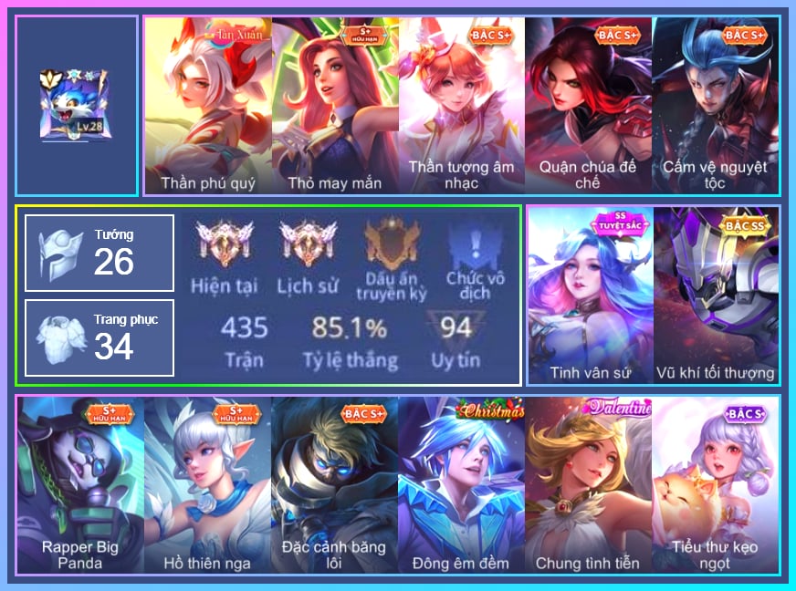 Valhein Hoàng tử Quạ, Valhein Số 7 Thần Sầu, Valhein Thần tài, Valhein S-Quang Vinh, Triệu Vân Quý Công Tử, Triệu Vân Thần Tài, Krixi Phó văn nghệ, Krixi Thuỷ Thủ, Gildur phượt thủ, Gildur Đại gia học viện, TelAnnas Cảnh Vệ Rừng, Telannas Thánh nữ mật hội, Telannas Dạ hội, Mina Tiểu thư đoạt hồn, Mina Đào tạo siêu sao, Thane Kẻ Hủy Diệt, Toro Bạch mao Ngưu, Veera Goá Phụ, Veera Thiên nga đen, Natalya Quý Cô Thủy Tề, Taara Đại tù trưởng, Taara Hỏa Ngọc Nữ Đế, Taara Hồng môn đường chủ, Kahlii Siêu đầu bếp, Thorne Cận vệ hoàng gia, Thorne Thám tử trung học, Zephys Phi thương, Zephys Tư lệnh viễn chinh, Alice Xứ sở thần tiên, Alice The Butterfly Mansion Girl, Preyta Không Tặc, Preyta Phi cơ F1, Điêu Thuyền Mèo công nghệ, Dirak Cảnh Vệ Bầu Trời, Dirak Quý tộc, Dirak Ông bầu Showbiz, Arduin, Hayate Bạch ảnh, Hayate Bạch lang, Sinestrea Giấc mơ trưa, Violet Nữ đặc cảnh, Violet Phó học tập, Violet Huy Chương Vàng, Ilumia Nữ Chúa Tuyết, Ilumia Thiên nữ áo dài, Ilumia Diva nổi loạn, Allain Lân sư Vũ thần, Airi Lễ hội mùa xuân, Laville Tay súng vô địch, Sephera Chiêm tinh gia, Sephera Phi vụ thế kỷ, Sephera Thủy Liên Hoa, Kaine Thợ Săn Chính Nghĩa, Capheny Thần tượng âm nhạc, Capheny S-Quang Vinh, Slimz Thỏ Thợ Mỏ, Lorion Chiến giáp hắc ám, Lorion Quân vương bóng tối, Astrid Hoa anh đào, Maloch Ác Ma Địa Ngục, Maloch Ác nhân vô tuyến, Volkath Tư lệnh viễn chinh, Volkath Quang vinh, Azzenka Ghẹo hay kẹo, Skud Sơn Tặc, Mganga Doombot Hủy Diệt, Florentino Vũ kiếm sư, Florentino Kiếm sĩ Olympic, Florentino S-Quang Vinh, Veres Đạo tặc, Veres Chị đại học đường, Moren Anh thợ điện, Marja Linh Xà Tư Tế, Ormarr CĐV Cuồng nhiệt, Lindis Đồng phục Shihakusho, Zuka Giáo Sư Sừng Sỏ, Zuka Phát Tài, Zuka Gấu Nhồi Bông, Zuka Đầu bếp hoàng cung, Zuka Rapper Big Panda, Zuka Xích Hùng Chiến Giáp, KilGroth Cảnh Vệ Biển, Paine khúc nhạc tử vong, Omen Sĩ Quan Viễn Chinh, Omen Thuyền trưởng hải tặc, Rouie Sứ giả vũ trụ, Rouie Quang Vinh, Butterfly Thủy thủ, Butterfly Teen Nữ Công Nghệ, Lauriel Đọa Lạc Thiên Sứ, Ata Quang vinh, Ata Mèo đi mưa, Cresht Thợ sửa cáp, Caesar Bão tố, Superman Chúa Tể Công Lý, Arthur Hoàng kim cốt, Arthur Siêu sao Cricket, Richter Quang vinh 2.0, Grakk Thuyền Trưởng Râu Đỏ, Grakk Khô Lâu Đại Tướng, Grakk Màu cờ sắc áo, Keera Học viên Carano, Keera Thuỷ thủ, Roxie Thám tử tập sự, Roxie Lễ hội hoa, Elsu Mafia, Tulen Phù Thủy Kiến Tạo, Zill Thần mộng mị, Amily Đặc cảnh NYPD, Amily Hội ám hoàng, Amily Thám tử trung học, Liliana Hồ Quý Phi, Errol Stream đến bao giờ, Raz Đại tù trưởng, Max Tiểu King Kong, Qi Thiếu nữ pháo hoa, Ngộ Không Đạo tặc, Ngộ Không Cổ thần Ai Cập, Dextra Chiến binh quyến rũ, Dextra Quý cô Tuổi Dần, Xeniel Kim sí điểu, Annette Xứ sở thần tiên, Yena Nữ hoàng thể thao, Yena Nữ cướp biển, Zip Cá siêu quậy, TeeMee Xiếc Cung Đình, Teemee Thịt xiên nướng, Ignis Bắc băng vương, Ignis Vì sao con khóc, Enzo Phẩm chất quý tộc, Enzo Chiến binh trăng khuyết, Enzo Thần thoại Hy Lạp, Enzo Leo núi, Elandorr Soái tặc, Bonnie S Quang Vinh, Quillen Trưởng ngoại khoa, Krizzix Crursed Corps