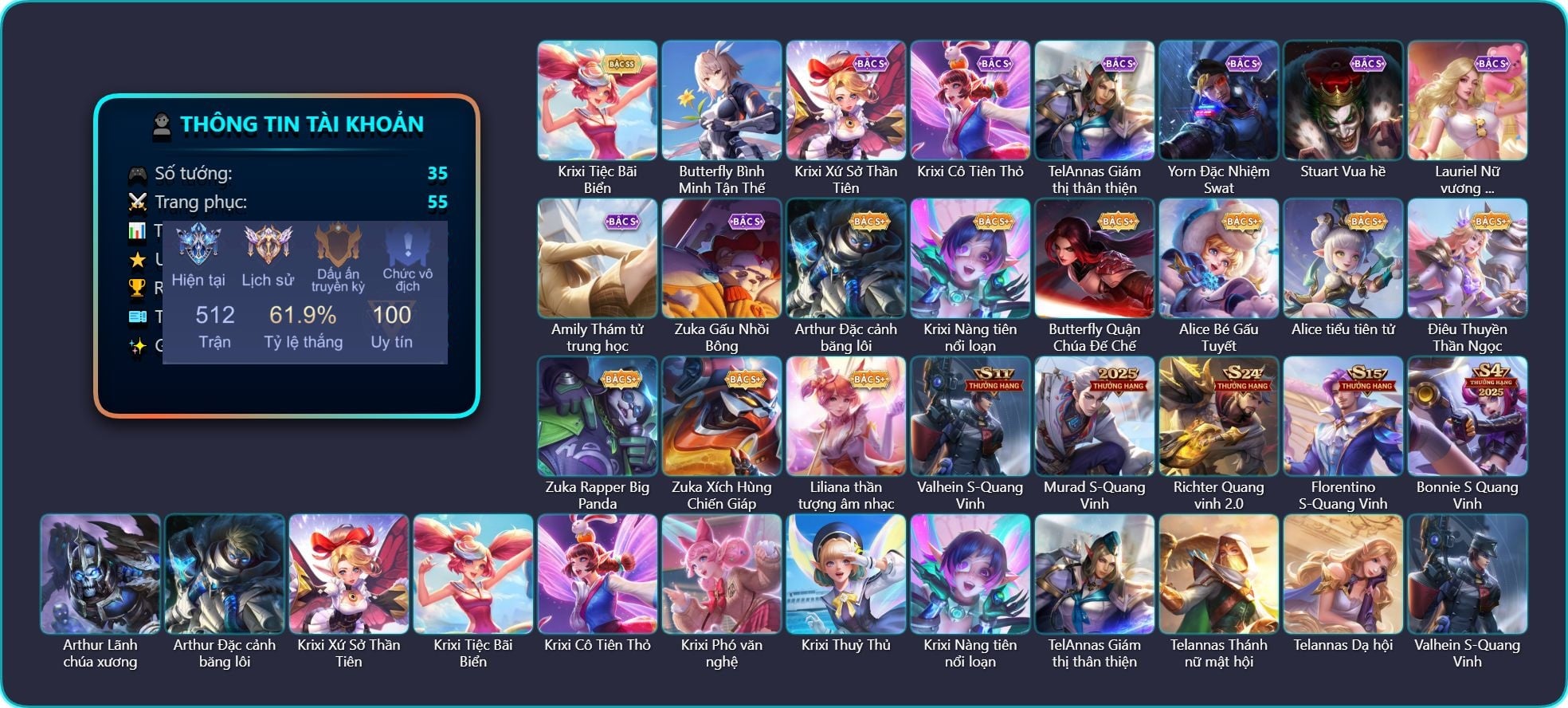 Arthur Đặc cảnh băng lôi, Krixi Phó văn nghệ, TelAnnas Giám thị thân thiện, Telannas Dạ hội, Tel Annas Jujutsu Sorcerer, Valhein Hoàng tử Quạ, Valhein Thần tài, Valhein Đệ nhất thần thám, Butterfly Xuân nữ ngổ ngáo, Butterfly Quận Chúa Đế Chế, Butterfly Bình Minh Tận Thế, Violet Tiệc bãi biển, Violet Đặc Dị, Violet Huy Chương Vàng, Natalya Quý Cô Thủy Tề, Triệu Vân Quý Công Tử, Allain Hạo thiên khuyển, Allain Lân sư Vũ thần, Maloch Đại ca Mukbang, Veera Thiên nga đen, Veera Phù thủy Hội họa, Stuart Vua hề, Grakk Thuyền Trưởng Râu Đỏ, Grakk Thần ẩm thực, Alice Xứ sở thần tiên, Alice Dạ hội, Alice The Butterfly Mansion Girl, Ngộ Không Cổ thần Ai Cập, Yorn Đặc Nhiệm Swat, Điêu Thuyền Nữ Vương Anh Đào, Điêu Thuyền Tà linh pháp trượng, Richter Quang vinh 2.0, Richter Cứu hộ, Florentino Kiếm sĩ Olympic, Florentino Thần thoại Hy Lạp, Florentino Hisoka, Florentino S-Quang Vinh, Annette Vân mộng tiên tử, Tachi Lãng khách, Tachi Đao khách vô tình, Lữ Bố Vũ điệu Samba, Azzenka Quang Vinh 2.0, AzzenKa Giáng sinh An lành, Aya Điệp viên ký ức, Airi Kiemono, Airi Đặc công tử điệp, Roxie Tiệc bánh kẹo, Roxie Hỏa thuật sư, Kaine Thợ Săn Chính Nghĩa, Elandorr Soái tặc, Elandorr Học viện Carano, Toro Bạch mao Ngưu, Rouie Mèo hầu gái, Zephys Đầu bếp Sashimi, Taara Tư lệnh hải âu, Zuka Đại Phú Ông, Zuka Xích Hùng Chiến Giáp, Amily Đặc cảnh NYPD, Amily Thám tử trung học, Liliana Thuỷ thủ hồ ly, Thane Khoảnh khắc vinh quang, Hayate Quỷ diện, Hayate Bạch lang, Enzo Chiến binh trăng khuyết, Enzo Thần thoại Hy Lạp, Enzo Leo núi, Sinestrea Lữ khách sa mạc, Sinestrea S-Quang vinh, Sinestrea Nữ Quỷ Say Ngủ, Lauriel Đọa Lạc Thiên Sứ, Lauriel Lạc thần, Murad M-TP Thần Tượng Học Đường, Murad Đồ thần đao, Zip Cá siêu quậy, Omega Cỗ Máy Siêu Tốc, Omega Hộ Vệ Carano, Darcy Pháp sư hỏa long, Celica S-Quang Vinh, Sephera Chiêm tinh gia, Sephera Phi vụ thế kỷ, Mganga Doombot Hủy Diệt, Slimz Lẩu chua cay, Slimz Sứ giả Thiên giới, Slimz Siêu Cấp Tối Thượng, Kahlii Tử điệp, Kahlii Rối Nước Thuỷ Đình, Keera Học viên Carano, Keera Thuỷ thủ, Keera Nghệ sĩ Graffiti, Keera Hồ điệp, Capheny S-Quang Vinh, Gildur Đại gia học viện, Gildur Thuyền trưởng râu bạc, Dextra Lữ khách cao nguyên, Aleister Thiếu Niên Hắc Ám, Mina Lưỡi hái hoàng kim, Dirak Ông bầu Showbiz, Laville Tay đua đường phố, Laville Xạ Thần Tinh Vệ, Laville Kim quy thần vương, Laville Thám tử học đường, Teemee Giấc Mơ Ngọt Ngào, Fennik Nhà thám hiểm, Fennik Đội đặc nhiệm, Fennik Shipper Siêu thanh, Zill Thần mộng mị, Astrid thần thoại hy lạp, Astrid Hoa anh đào, Elsu Cảnh vệ thảo nguyên, Elsu Mafia, Dolia Môn đồ tập sự, Nakroth Producer Tia chớp, Nakroth Siêu Việt 1, Arum Thần tượng nhạc Rock, Omen Thuyền trưởng hải tặc, Quillen Sao đỏ học đường, Quillen Huyết phong, Ishar Tiểu thư gấu trúc, Ishar Capoo Boom, Thorne Ước nguyện giáng sinh, Thorne Thám tử trung học, Volkath Quang vinh, KilGroth Càn Nguyên Thủ Vệ, Ignis Nguyệt lão, Ignis Vì sao con khóc, Ata Tân thủy thủ, Arduin Nhà vô địch, Krizzix Nghệ sĩ đường phố, Krizzix Crursed Corpse, Lumburr Golem thảo nguyên, Ybneth Hạt trưởng kiểm lâm, Ybneth Candy Bear, Max Trà Chanh, Yan nhà chế tác, Bonnie S Quang Vinh, Yue Chiêm Tinh gia, Ormarr Quỷ Vệ, Ryoma Thống Lãnh Quỷ Binh