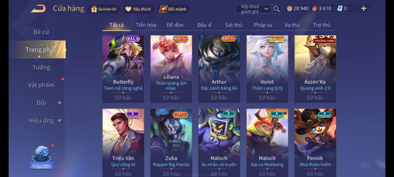 Arthur Đặc cảnh băng lôi, Krixi Phó văn nghệ, Telannas Dạ hội, Butterfly Teen Nữ Công Nghệ, Violet Huy Chương Vàng, Violet Thần long tỷ tỷ, Triệu Vân Quý Công Tử, Zuka Rapper Big Panda, Điêu Thuyền Mèo công nghệ, Maloch Ác nhân vô tuyến, Maloch Đại ca Mukbang, Richter Quang vinh 2.0, Azzenka Quang Vinh 2.0, Aya Điệp viên ký ức, Liliana thần tượng âm nhạc, Tulen Dạ hội, Fennik Nhà thám hiểm