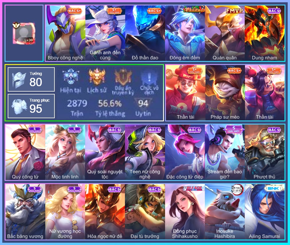 Valhein Hoàng tử Quạ, Valhein Thần tài, Valhein S-Quang Vinh, Triệu Vân Quý Công Tử, Triệu Vân Thần Tài, Krixi Thuỷ Thủ, Toro Bạch mao Ngưu, Nakroth BBoy công nghệ, Nakroth Quán quân, Nakroth Siêu Việt 1, Zephys Phi thương, Zephys Tư lệnh viễn chinh, Zephys Inosuke Hashibira, Mganga Hề cung đình, Mganga Pháp sư mèo, Lindis Thám Tử Tư, Lindis Đồng phục Shihakusho, Murad Thợ Săn Tiền Thưởng, Murad Đồ thần đao, Murad Thiên Tài Sân Cỏ, Murad S-Quang Vinh, Natalya Quý Cô Thủy Tề, Violet Nữ đặc cảnh, Violet Huy Chương Vàng, Skud Quang Vinh, Raz Đại tù trưởng, Alice Xứ sở thần tiên, Zill Dung nham, Gildur phượt thủ, Gildur Đại gia học viện, Gildur Đại võ sư, Jinna Đại Tư Tế, Cresht Thợ sửa cáp, Taara Đại tù trưởng, Taara Hỏa Ngọc Nữ Đế, Arthur Hoàng kim cốt, Arthur Siêu sao Cricket, Butterfly Thủy thủ, Butterfly Teen Nữ Công Nghệ, Butterfly Gánh anh đến cùng, Florentino Vũ kiếm sư, Điêu Thuyền Nữ Vương Anh Đào, Điêu Thuyền Nữ y tá, Airi Ninja Xanh Lá, Airi Đặc công tử điệp, Sephera Thủy Liên Hoa, Kriknak Bọ Cánh Bạc, KilGroth Cảnh Vệ Biển, Ignis Quang Vinh, Ignis Bắc băng vương, Lauriel Đọa Lạc Thiên Sứ, Lauriel Nữ vương học đường 2, Arduin, Arduin Quang Vinh, Marja Linh Xà Tư Tế, Veera Thiên nga đen, Tulen Nhà Thám Hiểm, Tulen Đông êm đềm, Tulen Dạ hội, Zuka Đại Phú Ông, Zuka Phát Tài, Wisp Hải Tặc Nhí, Aleister Thiếu Niên Hắc Ám, Aleister Quỷ soái nguyệt tộc, Elsu Mafia, Elsu Tuyết ưng, Volkath Tư lệnh viễn chinh, Errol Stream đến bao giờ, Amily Hội ám hoàng, Zata Tư lệnh viễn chinh, Ryoma Ailing Samurai, Quillen Sao đỏ học đường, Qi Thiếu nữ pháo hoa, Qi Blogger Ẩm thực, Arum Nữ hoàng gấu xám, Keera Học viên Carano, Hayate Bạch lang, TelAnnas Cảnh Vệ Rừng, Telannas Dạ hội, TelAnnas Quang Vinh, Dextra Quý cô Tuổi Dần, Annette Xứ sở thần tiên, Omen Sĩ Quan Viễn Chinh, Zip Cá siêu quậy, Roxie Lễ hội hoa, Enzo Thần thoại Hy Lạp, Ata Chiến Binh Hải Tộc, Lumburr, Moren Anh thợ điện, Maloch Ác nhân vô tuyến, Laville Tay đua đường phố, Rouie Quang Vinh, Omega Người máy xanh, Erin Mộc tinh linh, Celica S-Quang Vinh|CÁC SKIN SS: |CÁC SKIN SSS: |CÁC SKIN ANIME VIP: |ANIME TỔNG: Zephys Inosuke Hashibira, Lindis Đồng phục Shihakusho