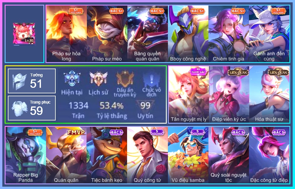 Valhein Hoàng tử Quạ, Valhein S-Quang Vinh, Triệu Vân Quý Công Tử, Krixi Thuỷ Thủ, Gildur Đại gia học viện, Yorn Soái ca bãi biển, Mganga Pháp sư mèo, Mina Đào tạo siêu sao, Taara Hỏa Ngọc Nữ Đế, Marja Linh Xà Tư Tế, Violet Huy Chương Vàng, Airi Đặc công tử điệp, Florentino Kiếm sĩ Olympic, Florentino Thần thoại Hy Lạp, Florentino Hisoka, Natalya Quý Cô Thủy Tề, Maloch Ác nhân vô tuyến, Maloch Đại ca Mukbang, Butterfly Thủy thủ, Butterfly Gánh anh đến cùng, Hayate Bạch lang, Darcy Pháp sư hỏa long, Lữ Bố Vũ điệu Samba, Zephys Tư lệnh viễn chinh, Zephys Inosuke Hashibira, Zephys Đầu bếp Sashimi, Sephera Chiêm tinh gia, Aleister Quỷ soái nguyệt tộc, Raz Đại tù trưởng, Raz Băng Quyền Quán Quân, Qi Tiểu long, Qi Blogger Ẩm thực, Fennik Nhà thám hiểm, Fennik Tiệc Bánh Kẹo, Fennik Tay đua F1, Nakroth BBoy công nghệ, Nakroth Quán quân, Telannas Dạ hội, Aya Điệp viên ký ức, Liliana Tân nguyệt mị ly, Alice The Butterfly Mansion Girl, Celica S-Quang Vinh, Celica Tâm hồn trà sữa, Murad S-Quang Vinh, Annette Xứ sở thần tiên, Tulen Dạ hội, Ilumia Ngược dòng thời gian, Ngộ Không Cổ thần Ai Cập, Thane Kẻ Hủy Diệt, Keera Nghệ sĩ Graffiti, Richter Quang vinh 2.0, Zuka Rapper Big Panda, Veres Đạo tặc, Bright Kỳ Lân Soái, Azzenka Quang Vinh 2.0, Roxie Hỏa thuật sư, Sinestrea Lữ khách sa mạc, Arthur Siêu sao Cricket, Capheny S-Quang Vinh