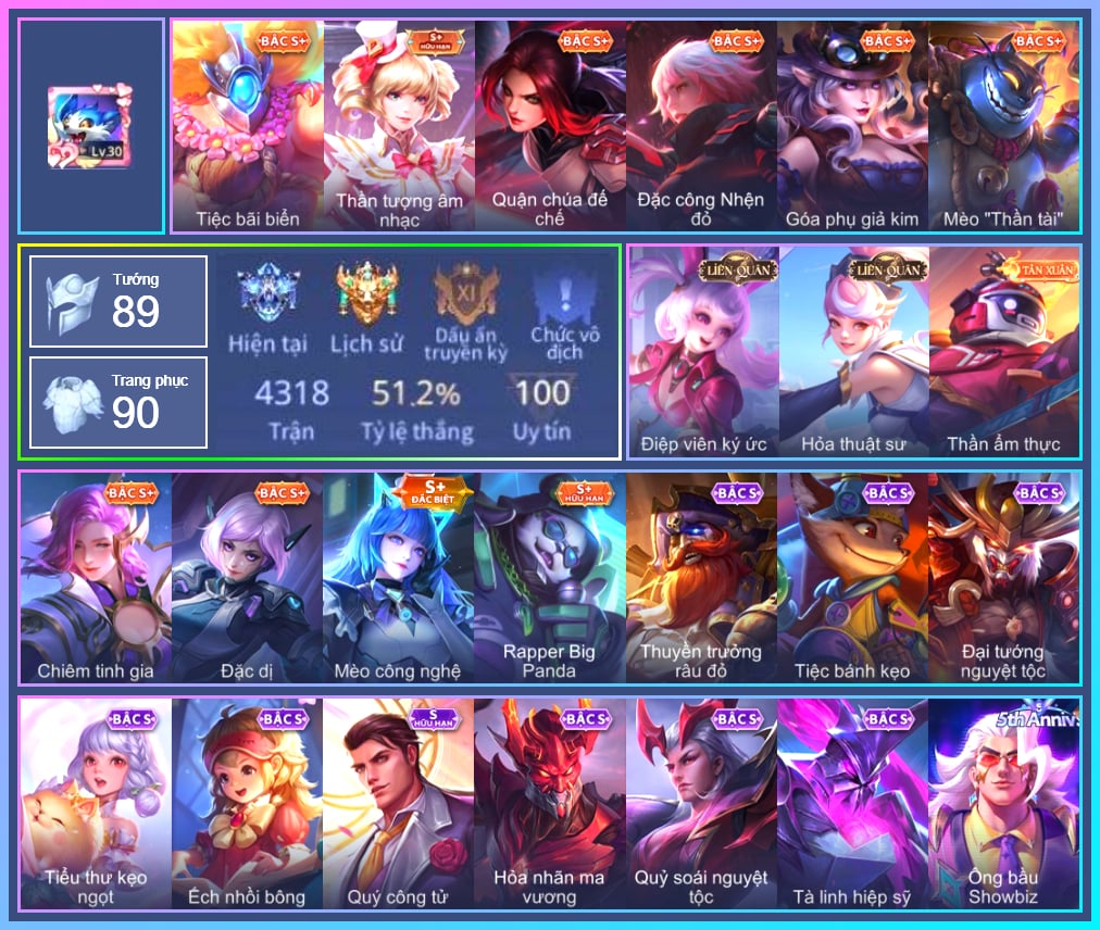 Valhein Hoàng tử Quạ, Valhein Xạ Thần, Valhein S-Quang Vinh, Triệu Vân Quý Công Tử, Krixi Thuỷ Thủ, Zephys Phi thương, Zephys Inosuke Hashibira, TelAnnas Cảnh Vệ Rừng, Telannas Dạ hội, TelAnnas Quang Vinh, Fennik Đội đặc nhiệm, Fennik Tiệc Bánh Kẹo, Laville Tay súng vô địch, Mina Đào tạo siêu sao, Natalya Quý Cô Thủy Tề, Veera Goá Phụ, Veera Thiên nga đen, Tulen Phù Thủy Kiến Tạo, Tulen Dạ hội, Azzenka Quang Vinh 2.0, Airi Lễ hội mùa xuân, Elandorr Phi vụ thế kỷ, Elandorr Học viện Carano, Butterfly Quận Chúa Đế Chế, Keera Học viên Carano, Max Hiệp Sĩ Nhí, Sinestrea Lữ khách sa mạc, Richter Quang vinh 2.0, Celica Nữ cao bồi, Celica S-Quang Vinh, Grakk Thuyền Trưởng Râu Đỏ, Grakk Mèo thần tài, Grakk Tiệc bãi biển, Grakk Thần ẩm thực, Kriknak Bọ Cánh Bạc, Ignis Bắc băng vương, Murad Thợ Săn Tiền Thưởng, Murad S-Quang Vinh, Hayate Bạch lang, Ryoma Đại Tướng Nguyệt Tộc, Ngộ Không Cổ thần Ai Cập, Capheny Thần tượng âm nhạc, Capheny S-Quang Vinh, Violet Nữ đặc cảnh, Violet Đặc Dị, Dirak Quý tộc, Dirak Ông bầu Showbiz, Dirak Đường chủ yêu giới, Zill Thần mộng mị, Ishar Tiểu thư kẹo ngọt, Annette Xứ sở thần tiên, Điêu Thuyền Mèo công nghệ, Lauriel Nữ vương học đường 2, Zuka Phát Tài, Zuka Đầu bếp hoàng cung, Zuka Rapper Big Panda, Ata Quang vinh, Ata Mèo đi mưa, Slimz Thỏ nhồi bông, Amily Đặc công nhện đỏ, Amily Hội ám hoàng, Amily Nữ đội trưởng, Raz Đại tù trưởng, Teemee Thịt xiên nướng, Omega Cỗ Máy Siêu Tốc, Omega Hộ vệ ba bích, Alice Xứ sở thần tiên, Alice Dạ hội, Qi Thiếu nữ pháo hoa, Qi Blogger Ẩm thực, Jinna Hỏa nhãn ma vương, Arduin Tà linh hiệp sỹ, Lindis Đồng phục Shihakusho, Kaine Người dơi, Roxie Lễ hội hoa, Roxie Hỏa thuật sư, Sephera Chiêm tinh gia, Aya Hoạt náo viên, Aya Điệp viên ký ức, Aleister Thiếu Niên Hắc Ám, Aleister Quỷ soái nguyệt tộc, Wisp Hải Tặc Nhí, Wisp Ếch nhồi bông, Rouie Quang Vinh, Ilumia Nữ Chúa Tuyết, Ilumia Ngược dòng thời gian, Liliana Thuỷ thủ hồ ly, Arum Thú Vệ Cổ Mộ, Dextra Lữ khách cao nguyên, Maloch Samurai Tử Sĩ