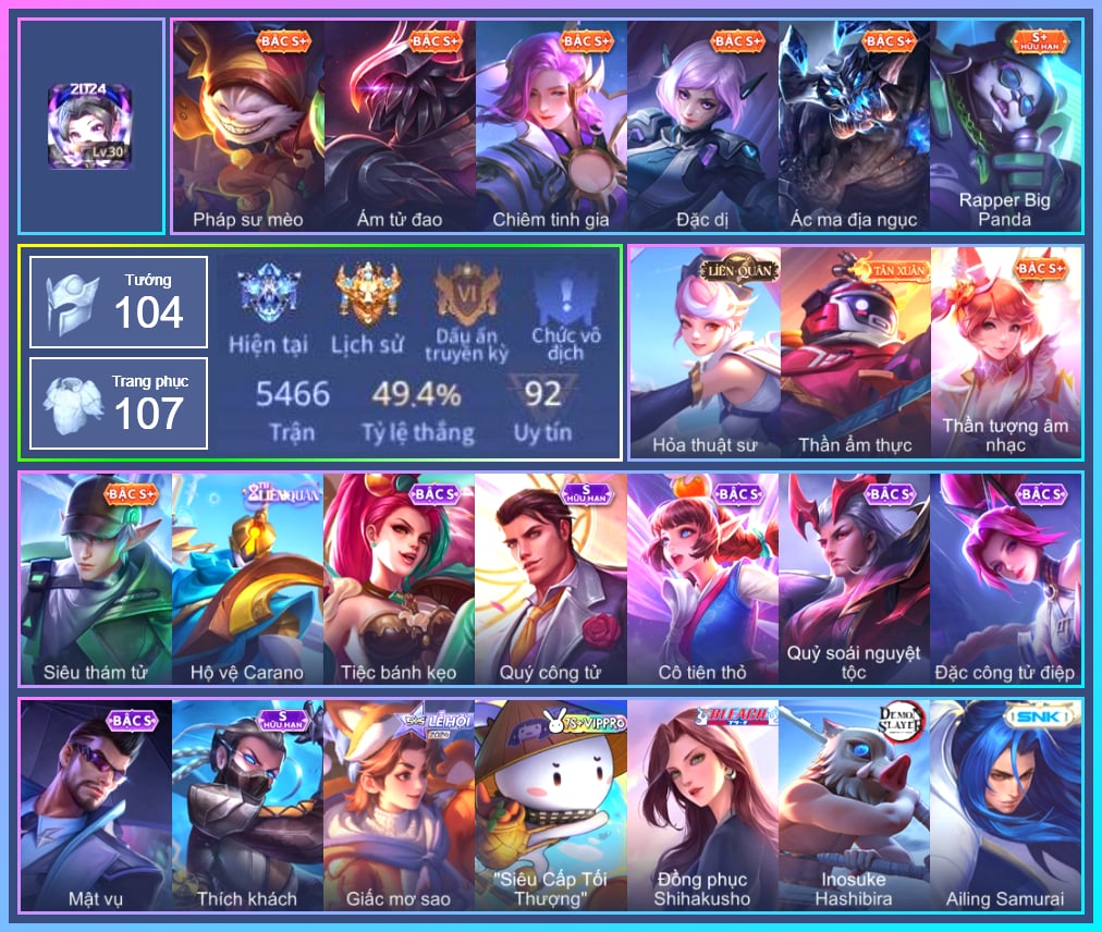Valhein Hoàng tử Quạ, Valhein Số 7 Thần Sầu, Valhein S-Quang Vinh, Triệu Vân Quý Công Tử, Yorn Soái ca bãi biển, Krixi Cô Tiên Thỏ, Krixi Thuỷ Thủ, Mganga Pháp sư mèo, Grakk Màu cờ sắc áo, Grakk Thần ẩm thực, Butterfly Thủy thủ, TelAnnas Cảnh Vệ Rừng, Telannas Dạ hội, TelAnnas Quang Vinh, Toro Bạch mao Ngưu, Toro Ngưu hải vương, Mina Tiệc Bánh Kẹo, Mina Đào tạo siêu sao, Wisp Hải Tặc Nhí, Maloch Ác Ma Địa Ngục, Maloch Ác nhân vô tuyến, Maloch Đại ca Mukbang, Teemee Thịt xiên nướng, Zephys Phi thương, Zephys Inosuke Hashibira, Zephys Đầu bếp Sashimi, Murad S-Quang Vinh, Gildur Đại gia học viện, Kahlii Cô dâu hắc ám, Kahlii Siêu đầu bếp, Kahlii Tử điệp, Amily Hội ám hoàng, Amily Nữ đội trưởng, Tachi Đao khách vô tình, Ata Quang vinh, Airi Thích Khách, Airi Đặc công tử điệp, Aleister Thiếu Niên Hắc Ám, Aleister Quỷ soái nguyệt tộc, Tulen Phù Thủy Kiến Tạo, Tulen Dạ hội, Qi Thiếu nữ pháo hoa, Qi Blogger Ẩm thực, Capheny Hầu gái, Capheny S-Quang Vinh, Bright Kỳ Lân Soái, Omega Cỗ Máy Siêu Tốc, Omega Hộ vệ ba bích, Omega Hộ Vệ Carano, Lindis Đồng phục Shihakusho, Elsu Tuyết ưng, Laville Tay đua đường phố, Zip Cá siêu quậy, Zuka Đầu bếp hoàng cung, Zuka Rapper Big Panda, Violet Đặc Dị, Enzo Thần thoại Hy Lạp, Enzo Nhà Leo núi, Zill Thần mộng mị, Nakroth Producer Tia chớp, Nakroth Siêu Việt 1, Roxie Cháy Phố, Roxie Lễ hội hoa, Roxie Hỏa thuật sư, Sephera Chiêm tinh gia, Sephera Thủy Liên Hoa, Yena Hoạt náo viên, Yena Nữ hoàng thể thao, Yena Nữ cướp biển, Elandorr Học viện Carano, Elandorr Siêu Thám Tử, Azzenka Quang Vinh 2.0, Rouie Quang Vinh, Superman Chúa Tể Công Lý, Liliana thần tượng âm nhạc, Liliana Thuỷ thủ hồ ly, Volkath Tư lệnh viễn chinh, Fennik Nhà thám hiểm, Fennik Đội đặc nhiệm, Omen Ám tử đao, Omen Thuyền trưởng hải tặc, Ilumia Diva nổi loạn, Ilumia Ngược dòng thời gian, Hayate Bạch lang, Ybneth Hạt trưởng kiểm lâm, Thane Kẻ Hủy Diệt, Thane Mật vụ, Baldum Đồ chơi, Richter Dạ hội, Richter Quang vinh 2.0, Richter Cứu hộ, Sinestrea Lữ khách sa mạc, Sinestrea S-Quang vinh, Slimz Lẩu chua cay, Slimz Siêu Cấp Tối Thượng, Alice Xứ sở thần tiên, Alice Dạ hội, Dirak Đường chủ yêu giới, Xeniel Shipper bánh mỳ, Keera Hồ điệp, Yan Giấc mơ sao, Celica S-Quang Vinh, Celica Tâm hồn trà sữa, Dextra Lữ khách cao nguyên, Ryoma Dạ hội, Ryoma Ailing Samurai, Arum Thần tượng nhạc Rock