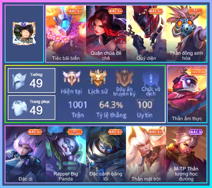 Valhein Hoàng tử Quạ, Valhein Xạ Thần, Triệu Vân Quý Công Tử, Krixi Thần Thoại Hy Lạp, Mina Tiểu thư đoạt hồn, Grakk Thần ẩm thực, Butterfly Gánh anh đến cùng, Maloch Ác nhân vô tuyến, Natalya Quý Cô Thủy Tề, Annette Xứ sở thần tiên, Taara Đại tù trưởng, Gildur Đại gia học viện, Veera Goá Phụ, Zephys Inosuke Hashibira, Ata Quang vinh, Kahlii Siêu đầu bếp, TelAnnas Cảnh Vệ Rừng, TelAnnas Chung Tình Tiễn, Telannas Dạ hội, TelAnnas Vũ khúc yêu hồ, TelAnnas Quang Vinh, Violet Đặc Dị, Violet Huy Chương Vàng, Baldum Đồ chơi, Tulen Dạ hội, Airi Thích Khách, Wonder Woman Thế Chiến, Ilumia Diva nổi loạn, Hayate Bạch lang, Capheny S-Quang Vinh, Rouie Quang Vinh, Alice Xứ sở thần tiên, Dextra Lữ khách cao nguyên, Keera Hồ điệp, Xeniel Shipper bánh mỳ, Aleister Quỷ soái nguyệt tộc, Aleister Xứ sở thần tiên, Raz Saitama Cosplay, Elandorr Phi vụ thế kỷ, Celica S-Quang Vinh, Zuka Phát Tài