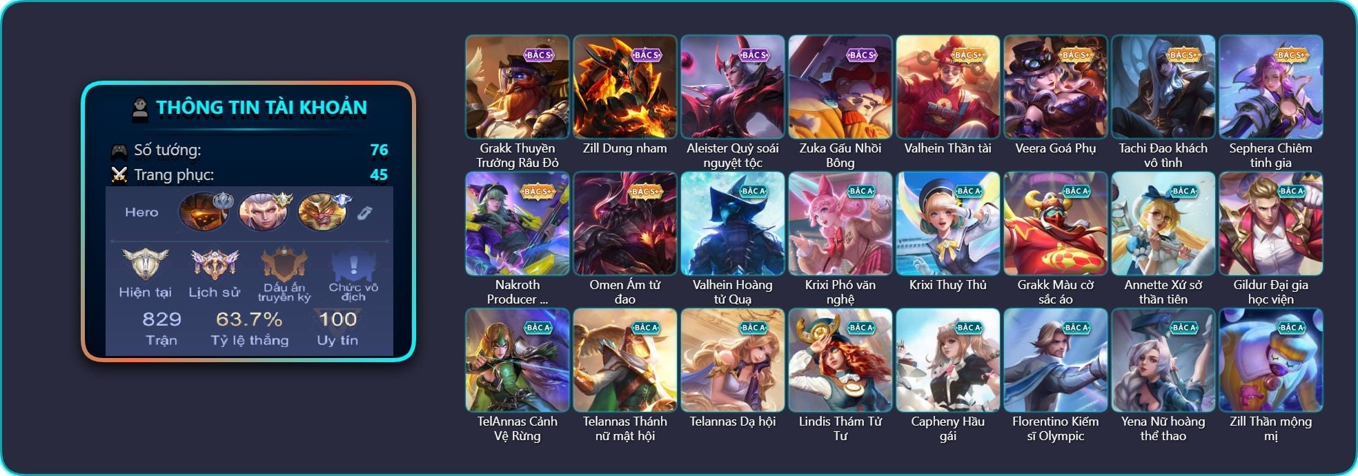 Valhein Hoàng tử Quạ, Valhein Xạ Thần, Valhein S-Quang Vinh, Triệu Vân Quý Công Tử, Triệu Vân Thần Tài, Krixi Phó văn nghệ, Krixi Thuỷ Thủ, Butterfly Gánh anh đến cùng, Maloch Đại ca Mukbang, Toro Ngưu hải vương, Annette Xứ sở thần tiên, Gildur Đại gia học viện, Preyta Không Tặc, Dirak Quý tộc, Dirak Đường chủ yêu giới, Arduin, Arduin Tà linh hiệp sỹ, Amily Đặc công nhện đỏ, Amily Hội ám hoàng, Kaine Người dơi, Lindis Thám Tử Tư, Veera Goá Phụ, Veera Thiên nga đen, Moren Anh thợ điện, Yorn Soái ca bãi biển, Murad S-Quang Vinh, Kahlii Siêu đầu bếp, Điêu Thuyền Nữ y tá, Fennik Nhà thám hiểm, Fennik Đội đặc nhiệm, Krizzix Đội đặc nhiệm, TelAnnas Cảnh Vệ Rừng, Telannas Thánh nữ mật hội, TelAnnas Quang Vinh, Florentino Vũ kiếm sư, Florentino Thần thoại Hy Lạp, Baldum, Airi Đặc công tử điệp, Zuka Phát Tài, Zuka Gấu Nhồi Bông, Zuka Rapper Big Panda, Kriknak Yêu trùng cổ mộ, Omen Thuyền trưởng hải tặc, Qi Tiểu long, Qi Thiếu nữ pháo hoa, Tulen Dạ hội, Tachi Đao khách vô tình, Violet Phó học tập, Violet Huy Chương Vàng, Elsu Tuyết ưng, Roxie Lễ hội hoa, Sephera Quý tiểu thư, Sephera Chiêm tinh gia, Liliana Hồ Quý Phi, Liliana thần tượng âm nhạc, Liliana Thuỷ thủ hồ ly, Thane Mật vụ, Slimz Siêu Cấp Tối Thượng, Taara Hỏa Ngọc Nữ Đế, Hayate Quỷ diện, Hayate Bạch lang, Rouie Quang Vinh, Chaugnar Quân cảnh, Elandorr Học viện Carano, Xeniel Thiên Sứ Hủy Diệt, Xeniel Kim sí điểu, Xeniel Shipper bánh mỳ, Alice The Butterfly Mansion Girl, Errol Stream đến bao giờ, Yena Hoạt náo viên, Ilumia Ngược dòng thời gian, Richter Quang vinh 2.0, Ryoma Thợ Săn Tiền Thưởng, Quillen Giám đốc âm nhạc, Celica S-Quang Vinh, Azzenka Quang Vinh 2.0, Sinestrea Lữ khách sa mạc, Sinestrea S-Quang vinh, Capheny S-Quang Vinh, Dextra Quý cô Tuổi Dần, Ignis Hỏa Thuật Sư, Enzo Phẩm chất quý tộc, Enzo Thần thoại Hy Lạp, Marja Linh Xà Tư Tế, Volkath Quang vinh, Arthur Siêu sao Cricket