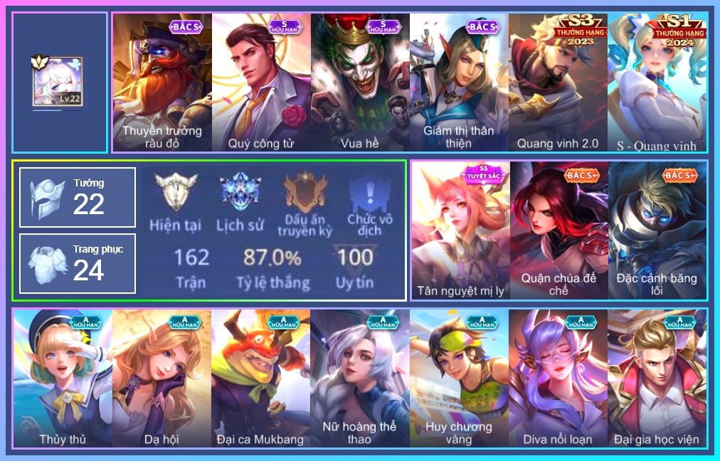 Arthur Siêu sao Cricket, Arthur Đặc cảnh băng lôi, Krixi Phó văn nghệ, Krixi Thuỷ Thủ, TelAnnas Giám thị thân thiện, Telannas Dạ hội, Butterfly Quận Chúa Đế Chế, Grakk Thuyền Trưởng Râu Đỏ, Liliana Tân nguyệt mị ly, Stuart Vua hề, Triệu Vân Quý Công Tử, Maloch Đại ca Mukbang, Yena Nữ hoàng thể thao, Richter Quang vinh 2.0, Violet Huy Chương Vàng, Ilumia Diva nổi loạn, Gildur Đại gia học viện, Tachi Lãng khách, Annette Xứ sở thần tiên, Capheny S-Quang Vinh, Alice Xứ sở thần tiên, Fennik Đội đặc nhiệm, Sephera Thủy Liên Hoa, Xeniel Shipper bánh mỳ