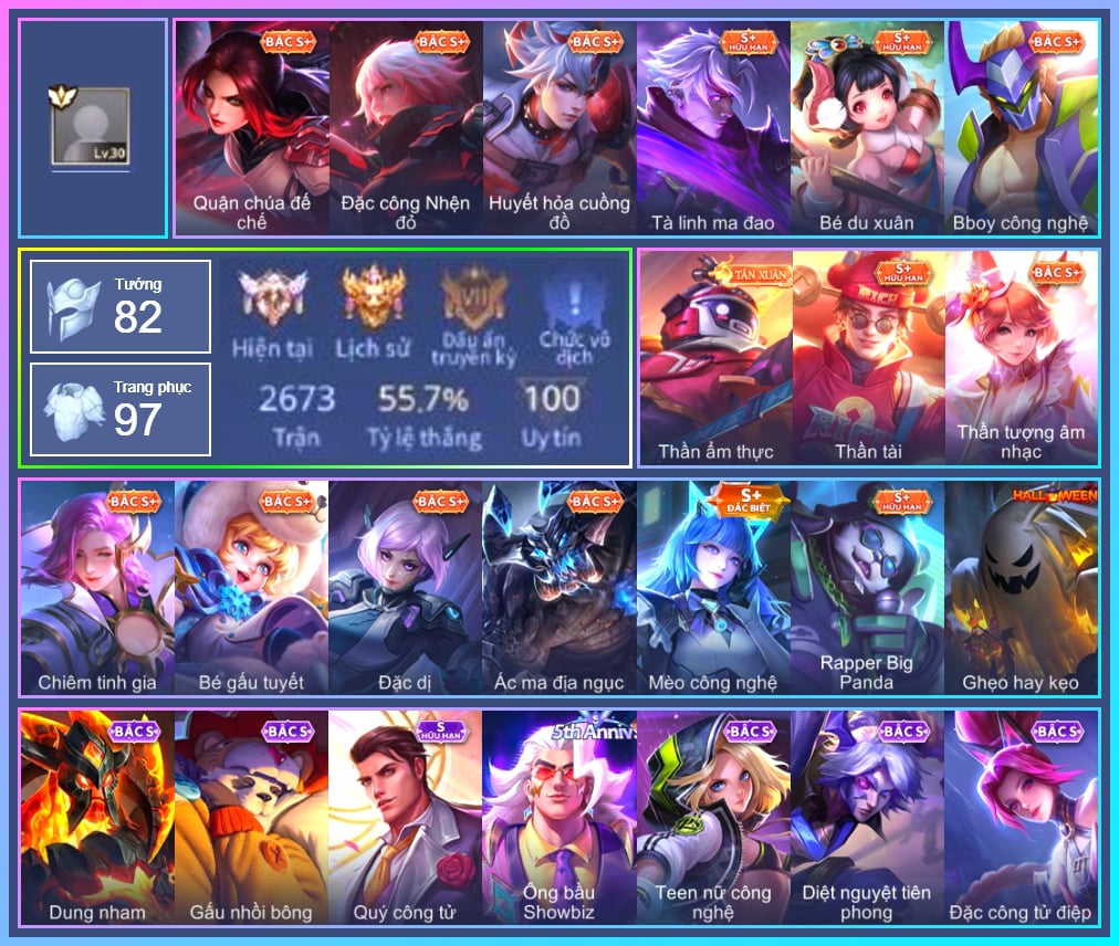 Valhein Hoàng tử Quạ, Valhein Số 7 Thần Sầu, Triệu Vân Quý Công Tử, Krixi Thuỷ Thủ, Murad Thợ Săn Tiền Thưởng, Murad Đồ thần đao, Murad S-Quang Vinh, Taara Hỏa Ngọc Nữ Đế, Arthur Hoàng kim cốt, Arthur Siêu sao Cricket, Gildur phượt thủ, Arduin Quang Vinh, Arduin Tà linh hiệp sỹ, Veera Goá Phụ, Kriknak Bọ Cánh Bạc, Natalya Quý Cô Thủy Tề, Elandorr Học viện Carano, KilGroth Cảnh Vệ Biển, Max Quang Vinh, Laville Tay súng vô địch, Teemee Tay đua siêu tốc, Yena Nữ hoàng thể thao, Zuka Đầu bếp hoàng cung, Zuka Rapper Big Panda, Fennik Tay đua F1, Preyta Phi cơ F1, Slimz Sứ giả Thiên giới, Ryoma Đại Tướng Nguyệt Tộc, Ryoma Dạ hội, Maloch Tiệc hóa trang, Maloch Ác nhân vô tuyến, Điêu Thuyền Mèo công nghệ, Wisp Hải Tặc Nhí, Omen Thuyền trưởng hải tặc, Capheny S-Quang Vinh, Qi Thiếu nữ pháo hoa, Veres Đạo tặc, Sephera Chiêm tinh gia, Sephera Phi vụ thế kỷ, Butterfly Teen Nữ Công Nghệ, Butterfly Quận Chúa Đế Chế, Butterfly Gánh anh đến cùng, Dirak Quý tộc, Zephys Inosuke Hashibira, Zephys Đầu bếp Sashimi, Paine khúc nhạc tử vong, Ata Quang vinh, Richter Bá tước, Richter Quang vinh 2.0, Ignis Bắc băng vương, Airi Thích Khách, Airi Đặc công tử điệp, Zip Ông trùm giáng sinh, Lindis Đồng phục Shihakusho, Florentino Thần thoại Hy Lạp, Zill Thần mộng mị, Roxie Lễ hội hoa, Roxie Hỏa thuật sư, Tulen Phù Thủy Kiến Tạo, Tulen Dạ hội, TelAnnas Chung Tình Tiễn, Telannas Dạ hội, TelAnnas Quang Vinh, Bright Kỳ Lân Soái, Violet Nữ đặc cảnh, Annette Thần tượng âm nhạc, Azzenka Quang Vinh 2.0, Ngộ Không Cổ thần Ai Cập, Sinestrea Lữ khách sa mạc, Ilumia Nữ Chúa Tuyết, Ilumia Diva nổi loạn
