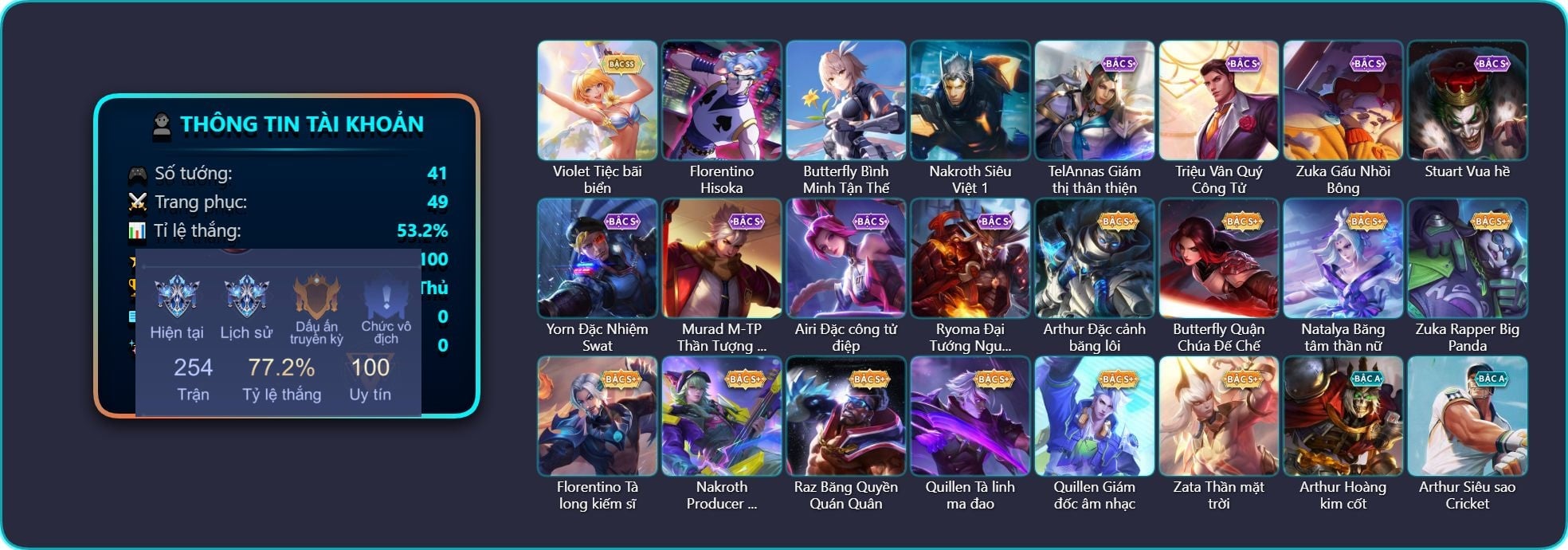 Arthur Hoàng kim cốt, Arthur Siêu sao Cricket, Arthur Đặc cảnh băng lôi, Krixi Phó văn nghệ, TelAnnas Giám thị thân thiện, Telannas Dạ hội, Butterfly Quận Chúa Đế Chế, Butterfly Bình Minh Tận Thế, Natalya Băng tâm thần nữ, Violet Tiệc bãi biển, Violet Huy Chương Vàng, Triệu Vân Quý Công Tử, Zuka Gấu Nhồi Bông, Zuka Rapper Big Panda, Allain Lân sư Vũ thần, Stuart Vua hề, Grakk Thần ẩm thực, Richter Quang vinh 2.0, Florentino Vũ kiếm sư, Florentino Kiếm sĩ Olympic, Florentino Tà long kiếm sĩ, Florentino Hisoka, Alice Dạ hội, Yorn Đặc Nhiệm Swat, Murad M-TP Thần Tượng Học Đường, Yena Nữ hoàng thể thao, Yena Hoa tiêu Mộng giới, Airi Đặc công tử điệp, Roxie Hỏa thuật sư, Azzenka Quang Vinh 2.0, Nakroth Producer Tia chớp, Nakroth Siêu Việt 1, Mganga Doombot Hủy Diệt, Zephys Đầu bếp Sashimi, Annette Xứ sở thần tiên, Capheny S-Quang Vinh, Raz Đại tù trưởng, Raz Băng Quyền Quán Quân, Tulen Đông êm đềm, Celica S-Quang Vinh, Ryoma Thợ Săn Tiền Thưởng, Ryoma Đại Tướng Nguyệt Tộc, Ryoma Ailing Samurai, Quillen Tà linh ma đao, Quillen Giám đốc âm nhạc, Hayate Bạch ảnh, KilGroth Cảnh Vệ Biển, Enzo Phẩm chất quý tộc, Zata Thần mặt trời