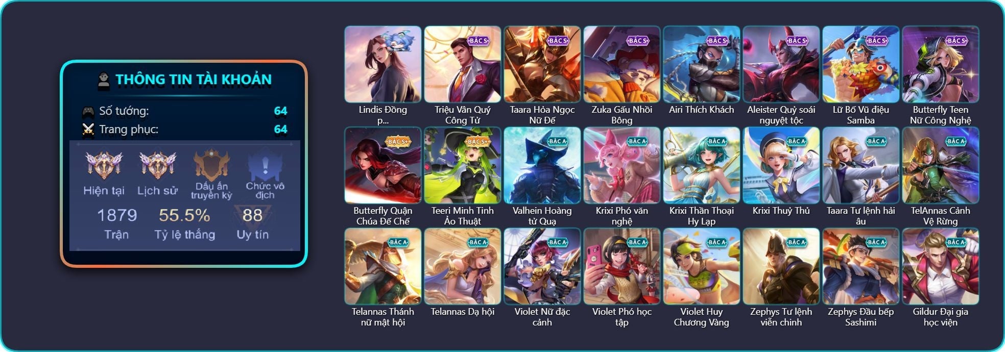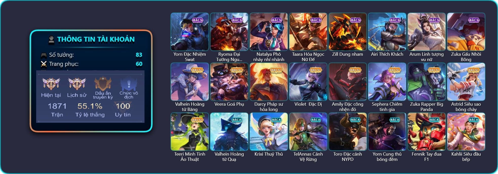 Valhein Hoàng tử Quạ, Valhein S-Quang Vinh, Triệu Vân Quý Công Tử, Krixi Phó văn nghệ, Krixi Thần Thoại Hy Lạp, Krixi Thuỷ Thủ, Taara Hỏa Ngọc Nữ Đế, Taara Tư lệnh hải âu, TelAnnas Cảnh Vệ Rừng, Telannas Thánh nữ mật hội, Telannas Dạ hội, TelAnnas Quang Vinh, Violet Nữ đặc cảnh, Violet Phó học tập, Violet Huy Chương Vàng, Zephys Tư lệnh viễn chinh, Zephys Đầu bếp Sashimi, Gildur Đại gia học viện, Celica S-Quang Vinh, Yena Nữ hoàng thể thao, Qi Thiếu nữ pháo hoa, Zip Cá siêu quậy, Dirak Quý tộc, Bright Soái ca thánh điện, Murad Thợ Săn Tiền Thưởng, Murad Điệp viên Anubis, Zuka Gấu Nhồi Bông, Zuka Đầu bếp hoàng cung, Amily Hội ám hoàng, Florentino Vũ kiếm sư, Airi Thích Khách, Capheny S-Quang Vinh, Skud Sơn Tặc, Raz Đại tù trưởng, Raz Saitama Cosplay, Zill Thần mộng mị, Ata Quang vinh, Ata Giao Long, Arthur Hoàng kim cốt, Arthur Siêu sao Cricket, Slimz Thỏ Thợ Mỏ, Sinestrea S-Quang vinh, Aleister Quỷ soái nguyệt tộc, Aleister S - Quang Vinh, Ngộ Không Đạo tặc, Ngộ Không Cổ thần Ai Cập, Arum Nữ hoàng gấu xám, Lindis Đồng phục Shihakusho, Kriknak Bọ Cánh Bạc, Lữ Bố Vũ điệu Samba, Dextra Quý cô Tuổi Dần, Butterfly Teen Nữ Công Nghệ, Butterfly Quận Chúa Đế Chế, Tulen Phù Thủy Kiến Tạo, Veera Thiên nga đen, Roxie Lễ hội hoa, Annette Xứ sở thần tiên, Azzenka Quang Vinh 2.0, Quillen Trưởng ngoại khoa, Baldum Đồ chơi, Bijan Giai Điệu Giáng Sinh, Ryoma Ailing Samurai, Omen Sĩ Quan Viễn Chinh, Teeri Minh Tinh Ảo Thuật