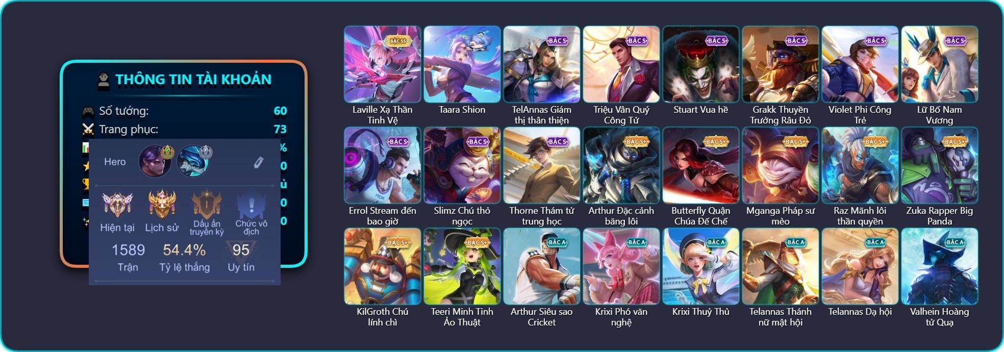 Arthur Siêu sao Cricket, Arthur Đặc cảnh băng lôi, Krixi Phó văn nghệ, Krixi Thuỷ Thủ, TelAnnas Giám thị thân thiện, Telannas Thánh nữ mật hội, Telannas Dạ hội, Valhein Hoàng tử Quạ, Valhein Số 7 Thần Sầu, Valhein S-Quang Vinh, Butterfly Quận Chúa Đế Chế, Triệu Vân Quý Công Tử, Maloch Ác nhân vô tuyến, Stuart Vua hề, Grakk Thuyền Trưởng Râu Đỏ, Grakk Thần ẩm thực, Ngộ Không Cổ thần Ai Cập, Violet Phi Công Trẻ, Violet Phó học tập, Alice Xứ sở thần tiên, Yorn Cung thủ bóng đêm, Yorn Soái ca bãi biển, Rouie Quang Vinh, Florentino Thần thoại Hy Lạp, Florentino S-Quang Vinh, Lữ Bố Nam Vương, Lữ Bố Hoả Long Chiến Thần, Laville Xạ Thần Tinh Vệ, Qi Blogger Ẩm thực, Yena Nữ hoàng thể thao, Yena Hoa tiêu Mộng giới, Mganga Pháp sư mèo, Mganga Doombot Hủy Diệt, Kaine Đôi Cánh Đại Dương, Kaine Người dơi, Kaine Thợ Săn Chính Nghĩa, Ignis Vì sao con khóc, Annette Xứ sở thần tiên, Raz Đại tù trưởng, Raz Mãnh lôi thần quyền, Zill Thần mộng mị, Mina Đào tạo siêu sao, Taara Shion, Errol Stream đến bao giờ, Zuka Đầu bếp hoàng cung, Zuka Rapper Big Panda, Murad S-Quang Vinh, Kriknak Bọ Cánh Bạc, Keera Học viên Carano, Paine khúc nhạc tử vong, Ilumia Ngược dòng thời gian, Enzo Phẩm chất quý tộc, Enzo Thần thoại Hy Lạp, Enzo Nhà Leo núi, Richter Quang vinh 2.0, Azzenka Quang Vinh 2.0, Capheny S-Quang Vinh, Aleister Thiếu Niên Hắc Ám, Aleister S - Quang Vinh, Hayate Bạch ảnh, Lauriel Đọa Lạc Thiên Sứ, Bonnie S Quang Vinh, Elsu Tuyết ưng, Elsu Xạ Thần Mộng Giới, Ishar Quận chúa sông Nile, Max Tiểu King Kong, Baldum thần thoại hy lạp, Slimz Chú thỏ ngọc, KilGroth Chú lính chì, Thorne Thám tử trung học, Sinestrea Lữ khách sa mạc, Ybneth Candy Bear, Teeri Minh Tinh Ảo Thuật