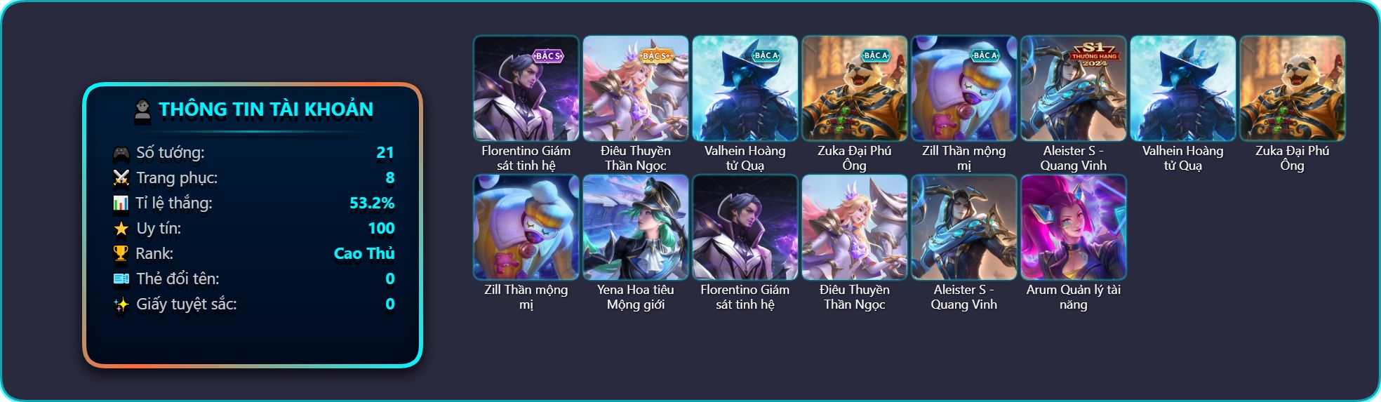 Valhein Hoàng tử Quạ, Valhein Vũ khí tối thượng, Valhein Xạ Thần, Valhein S-Quang Vinh, Triệu Vân Quý Công Tử, Krixi Thuỷ Thủ, Gildur Đại gia học viện, Veera Goá Phụ, Veera Thiên nga đen, Taara Hỏa Ngọc Nữ Đế, Mganga Hề cung đình, Mina Tiểu thư đoạt hồn, Mina Đào tạo siêu sao, Violet Nữ đặc cảnh, Violet Huy Chương Vàng, Kriknak Bọ Cánh Bạc, Stuart Trò đùa tử vong, Zuka Phát Tài, Zuka Đầu bếp hoàng cung, Zuka Rapper Big Panda, Arduin Quang Vinh 1, Omen Sĩ Quan Viễn Chinh, Omen Chiến binh trăng khuyết, Richter Dạ hội, Richter Quang vinh 2.0, Tulen Nhà Thám Hiểm, Tulen Đông êm đềm, Tulen Dạ hội, Murad S-Quang Vinh, Zephys Tư lệnh viễn chinh, Zephys Inosuke Hashibira, Max Quang Vinh, Max Chuyên gia đập hộp, Volkath Tư lệnh viễn chinh, Rouie Quang Vinh, Alice Dạ hội, Alice The Butterfly Mansion Girl, Errol Stream đến bao giờ, Ormarr Cựu chiến binh, Teemee Tay đua siêu tốc, Fennik Nhà thám hiểm, Fennik Đội đặc nhiệm, Fennik Tay đua F1, Yena Nữ hoàng thể thao, Preyta Phi cơ F1, Kahlii Kim cô giáo chủ, Kahlii Siêu đầu bếp, Hayate Bạch lang, Qi Thiếu nữ mùa xuân, Qi Blogger Ẩm thực, Wisp Hải Tặc Nhí, Capheny Thần tượng âm nhạc, Dirak Quý tộc, Dirak Ông bầu Showbiz, Dirak Đường chủ yêu giới, Moren Anh thợ điện, Florentino Thần thoại Hy Lạp, Airi Thích Khách, Airi Lễ hội mùa xuân, Roxie Thám tử tập sự, Roxie Hầu gái, Roxie Lễ hội hoa, Laville Tay súng vô địch, Omega Hộ vệ ba bích, Sephera Chiêm tinh gia, Sephera Phi vụ thế kỷ, Sephera Thủy Liên Hoa, TelAnnas Cảnh Vệ Rừng, TelAnnas Chung Tình Tiễn, Telannas Dạ hội, TelAnnas Quang Vinh, Butterfly Gánh anh đến cùng, Raz Đại tù trưởng, Raz Saitama Cosplay, Zill Dung nham, Zill Thần mộng mị, Ata Quang vinh, Grakk Thuyền Trưởng Râu Đỏ, Grakk Màu cờ sắc áo, Ryoma Đại Tướng Nguyệt Tộc, Ryoma Dạ hội, Thorne Cận vệ hoàng gia, Kaine Đôi Cánh Đại Dương, Kaine Người dơi, Arum Nữ hoàng gấu xám, Amily Đặc công nhện đỏ, Amily Hội ám hoàng, Amily Nữ đội trưởng, Aleister Quỷ soái nguyệt tộc, Zip Cá siêu quậy, Ngộ Không Cổ thần Ai Cập, Enzo Leo núi, Ilumia Diva nổi loạn, Ilumia Ngược dòng thời gian, Arthur Siêu sao Cricket