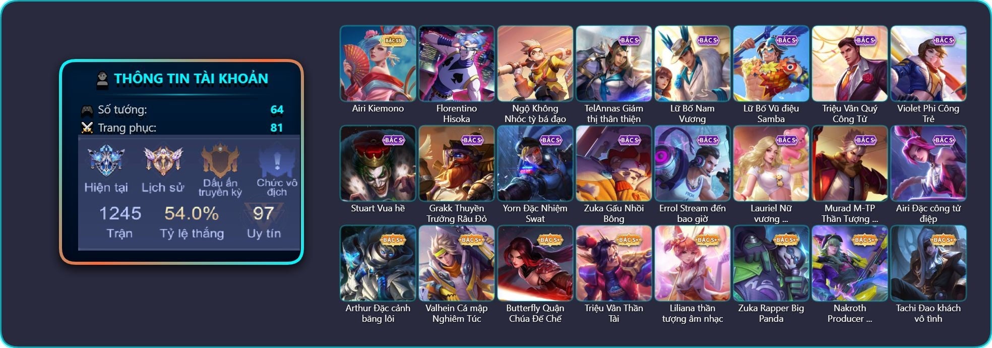 TelAnnas Giám thị thân thiện, Telannas Dạ hội, TelAnnas Quang Vinh, Valhein Vũ khí tối thượng, Valhein Xạ Thần, Arthur Đặc cảnh băng lôi, Butterfly Quận Chúa Đế Chế, Butterfly Gánh anh đến cùng, Violet Nữ đặc cảnh, Violet Phi Công Trẻ, Krixi Phó văn nghệ, Lữ Bố Nam Vương, Natalya Quý Cô Thủy Tề, Tulen Nhà Thám Hiểm, Tulen Dạ hội, Alice Xứ sở thần tiên, Triệu Vân Quý Công Tử, Triệu Vân Thần Tài, Hayate Bạch lang, Maloch Ác Ma Địa Ngục, Maloch Ác nhân vô tuyến, Stuart Vua hề, Grakk Màu cờ sắc áo, Yorn Đặc Nhiệm Swat, Airi Thích Khách, Airi Ninja Xanh Lá, Roxie Lễ hội hoa, Ngộ Không Cổ thần Ai Cập, Elsu Mafia, Kahlii Siêu đầu bếp, Kriknak Bọ Cánh Bạc, Omega Hộ vệ ba bích, Aleister Thiếu Niên Hắc Ám, Zill Lốc Địa Ngục, Slimz Xứ sở thần tiên, Lauriel Nữ vương học đường 2, Mina Kẹo hay ghẹo, Mina Đào tạo siêu sao, Darcy Nam tước, Murad S-Quang Vinh, Keera Y tá lạ, Thorne Cận vệ hoàng gia, Fennik Nhà thám hiểm, Fennik Shipper Siêu thanh, Qi Blogger Ẩm thực, Quillen Sao đỏ học đường, Zuka Giáo Sư Sừng Sỏ, Zuka Phát Tài, Arum Thú Vệ Cổ Mộ, Arum Linh tượng vu nữ, Arum Quản lý tài năn